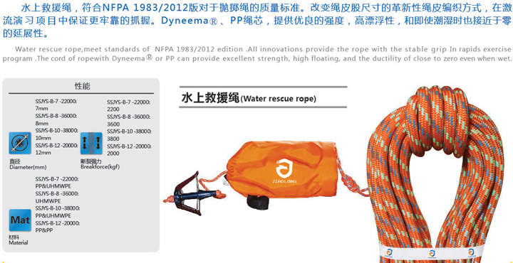 革新性繩皮編織方式,在激流演習項目中保證更牢靠的抓握。質量輕便,可漂浮于水面,繩體用鮮艷的橘紅色或橘黃色亮色系為主,具有反光和夜光功能,在危險時刻容易辨識,為生命保駕護航??蛇x用丙綸、超高分子量聚乙烯等不同材料,通過先進的生產工藝實現繩索的高強度、易識別、可漂浮等。適用于水上訓練、救援等領域。